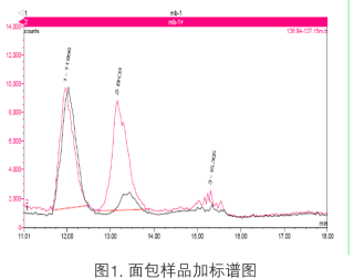 從市場和超市中選取兩種面包產(chǎn)品,上述離子色譜條件分析,所得回收率結(jié)果分別為98%和106%。樣品加標色譜圖如圖2所示。表1為面包樣品的測定結(jié)果。由這些數(shù)據(jù)可以看出,在所檢測的兩種面包中均含有不同含量的溴酸鹽。
